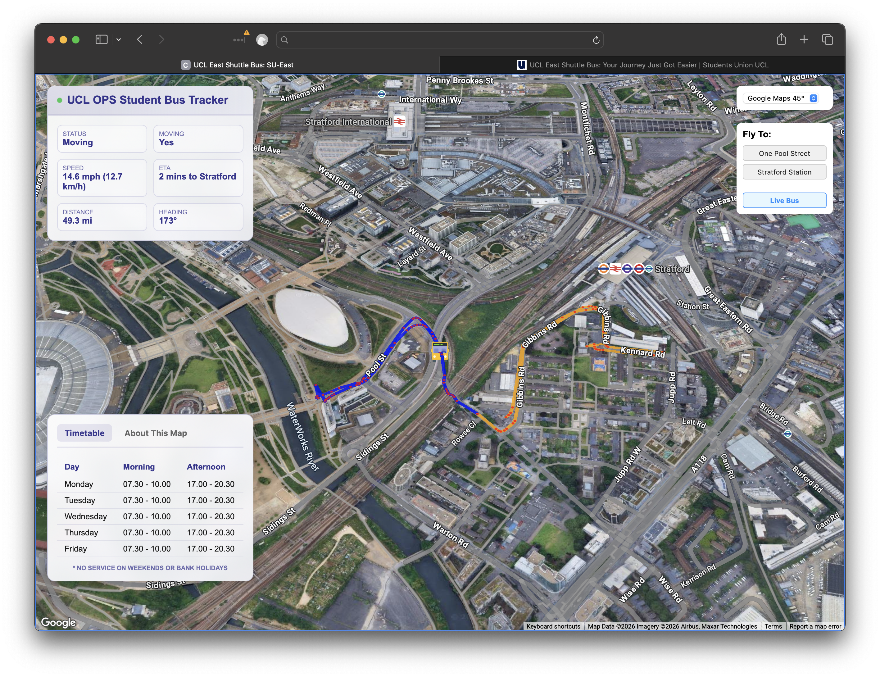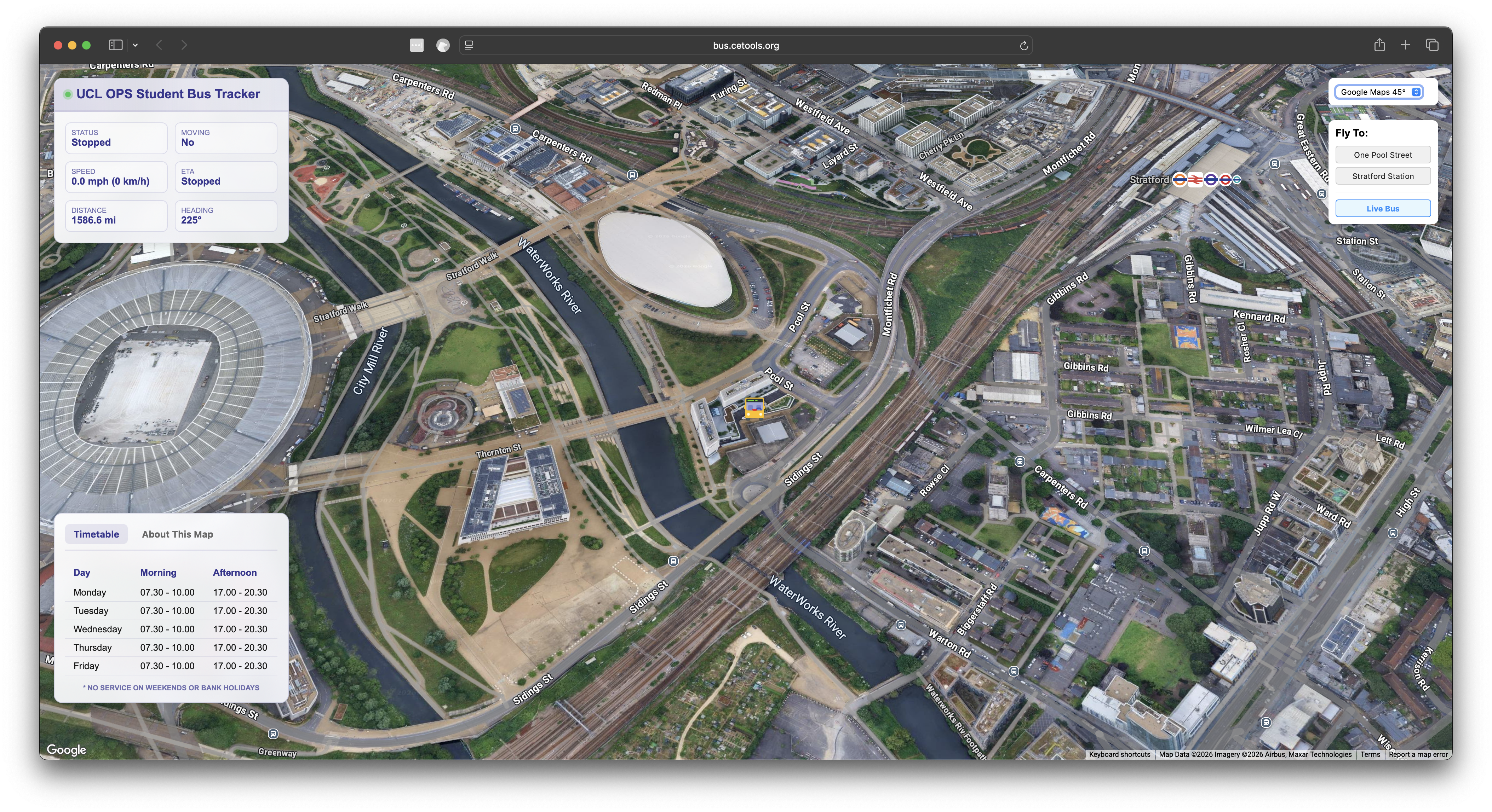 Connected Environments have built an IoT Bus Tracker for an excellent student led shuttle service between Stratford Station and UCL East. The service is run completely by students and is free to use. Hosted on UCL servers, the live view of the shuttle is at: https://bus.cetools.org/.