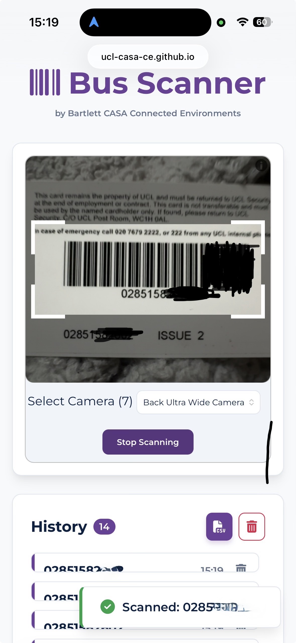 After a succesful launch in at the start of 2026, the app has been running smoothly and has been costing about 9p per day on a giffgaff pay as you go SIM. As a result of this app and chatting to Bal in the canteen a request came in to ask if we knew of a scanner he could buy to scan student ID cards and record when students were using the bus. 24 hours later we had built the second part of the project - a web app for scanning student ID card barcodes and saving a timestamped list of codes in a CSV file that can be downloaded to your phone. GitHub repo is here.